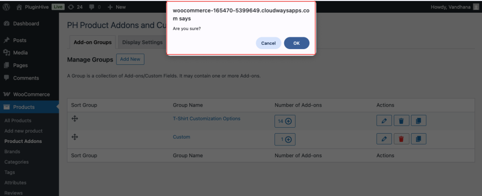 Note: Deleting a group will remove all add-ons within that group and detach them from the assigned products or categories.