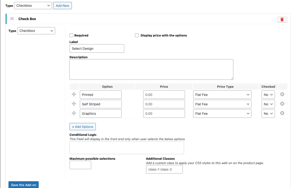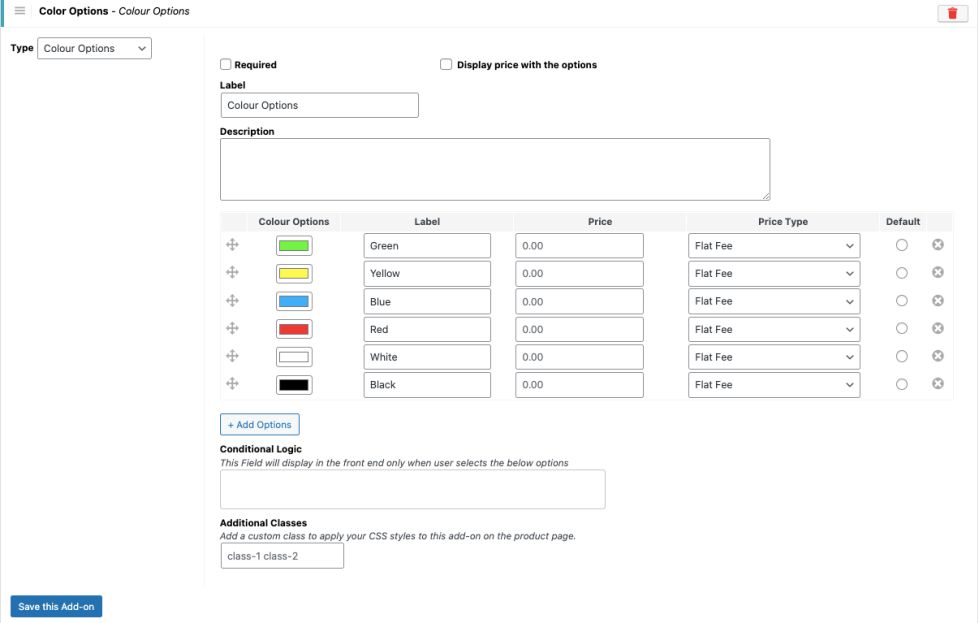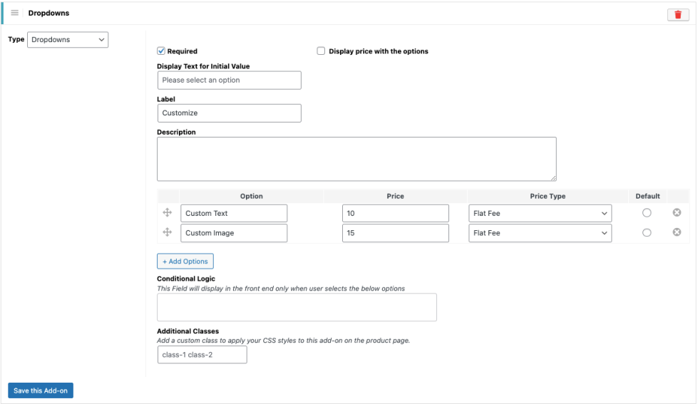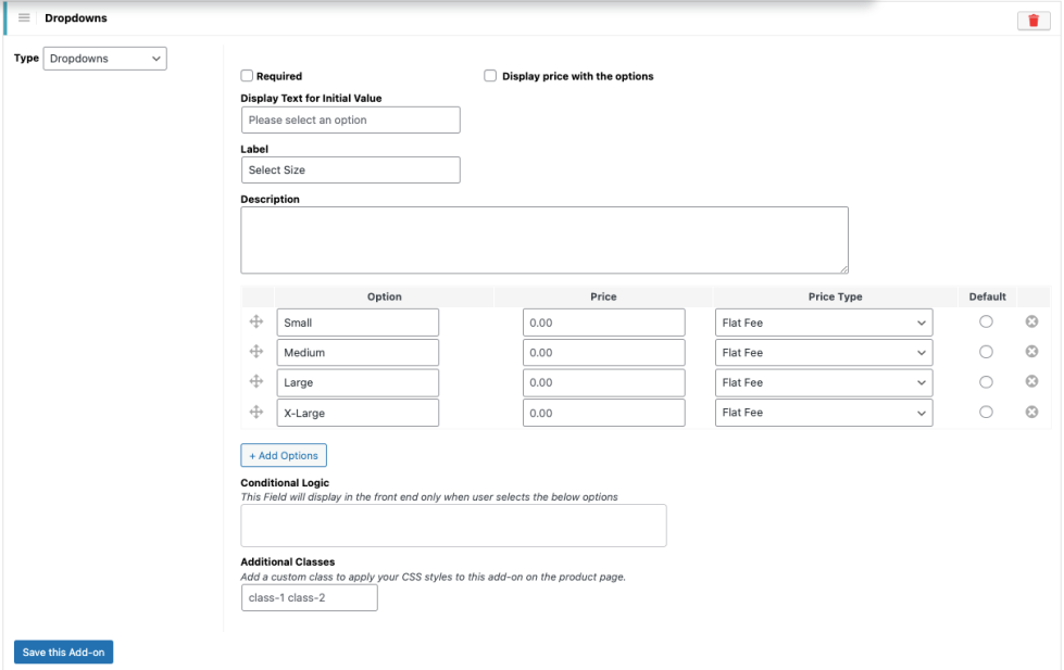 Enabling this option displays the add-on price next to each option on the product page. - Conditional Logic