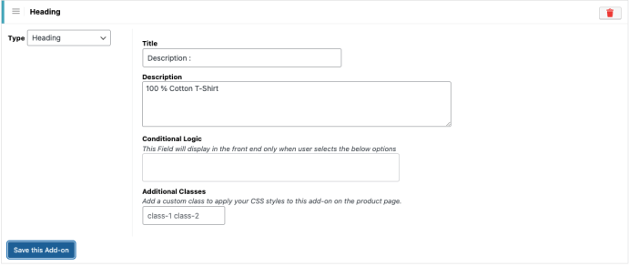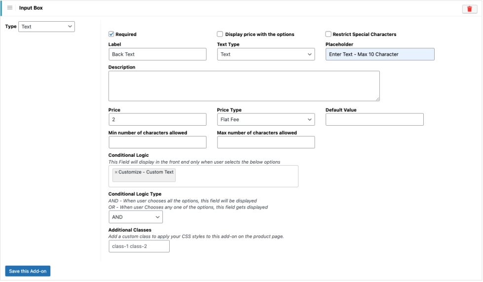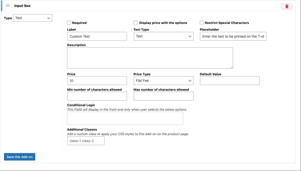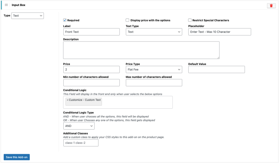 This field allows you to add one or more custom CSS class names to the add-on. These classes can be used to apply custom styling to the add-on on the product page using CSS.