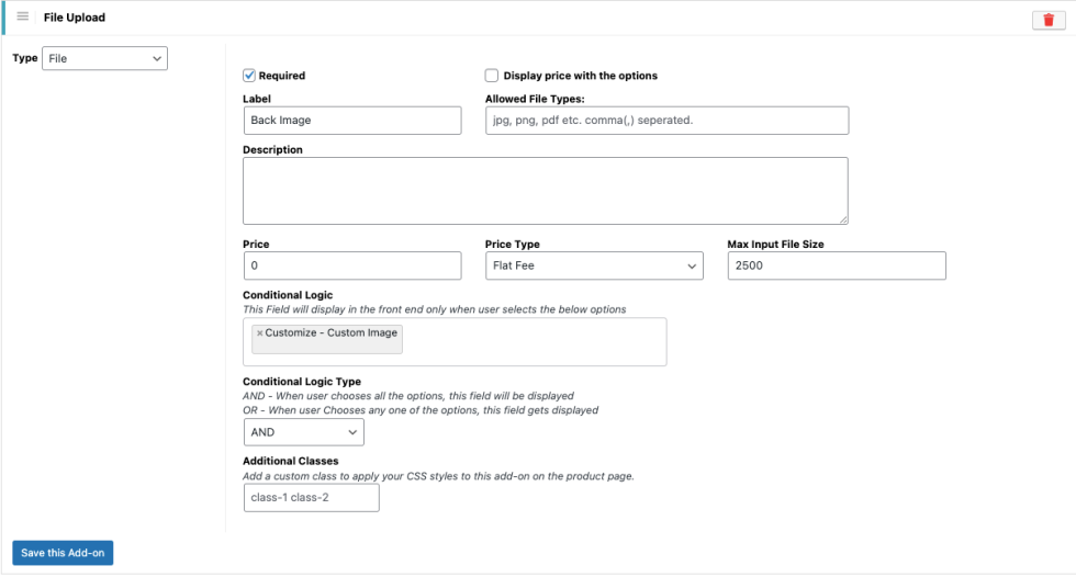 Create a File Upload addon to allow the customer to provide the image they want to print on the front and back sides of the T-shirt. This File Upload option will be triggered using the Conditional logic option. When the customer selects the option โCustom Image,โ the File Upload options will be shown as below.