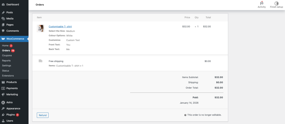 - Order Details: After the order is placed, the selected product add-ons are visible in the Edit Order page in the WooCommerce admin dashboard. This allows the store admin to view all customer-selected options while processing the order.