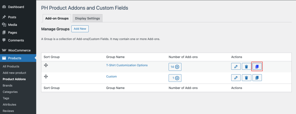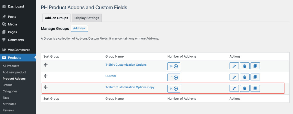 To duplicate an existing Product Addon Group: