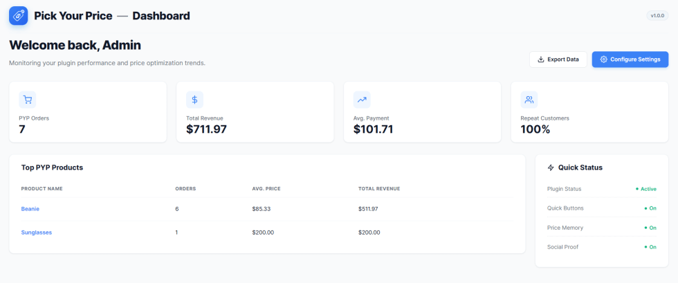 ↑ Back to topTo deactivate without removing data — Go to Plugins > Installed Plugins, find Pick Your Price, and click Deactivate. All settings, memory data, and analytics are preserved for later reactivation.