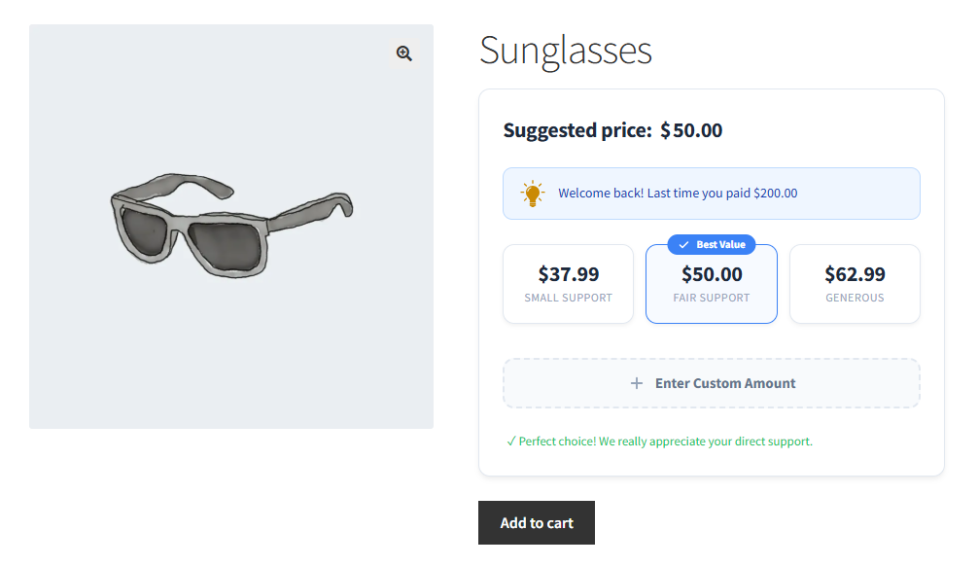 New customers see the suggested price pre-filled in the input field, Quick Buttons for one-tap selection (if enabled), Social Proof showing what others have paid (if enabled and threshold met), and your custom Add to Cart button text.