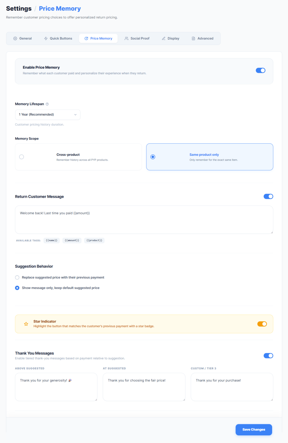 ↑ Back to topGo to Pick Your Price > Settings in your admin sidebar. Settings are organized into tabs.