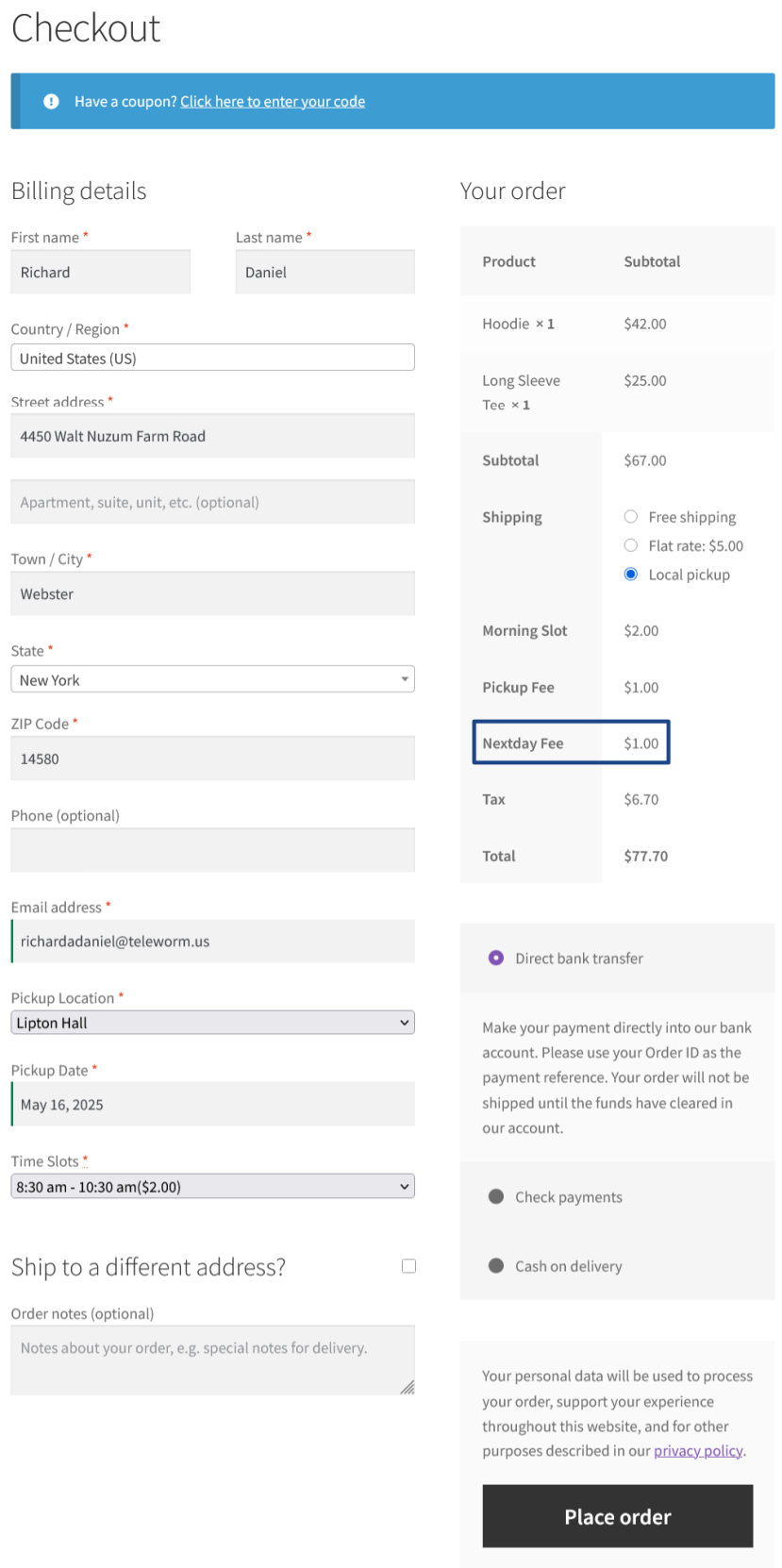 You can optionally charge a fee for Next Day Pickup orders. The value set in this field will be charged as fee.