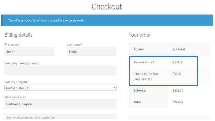 - The order with the offer product(s) will be processed as a separate order.