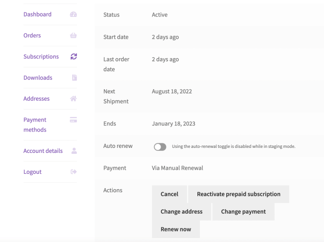 Your clients will find adjustments to the subscription page in their accounts as well. They can see the next shipment and next payment date (which will be different in most cases):