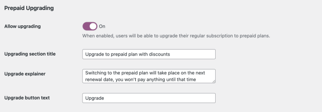 On the plugin setting page, you can find the section called ‘Prepaid Subscription Cancelling’, from where you can control how the canceling of prepaid subscriptions will be.