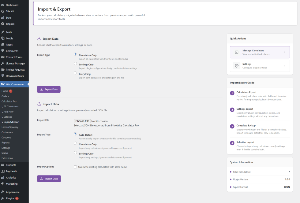 Go to Calculators > Import/Export and click Export. Keep that file safe. If you ever migrate your site or something gets deleted, re-import it and everything comes back exactly as it was.