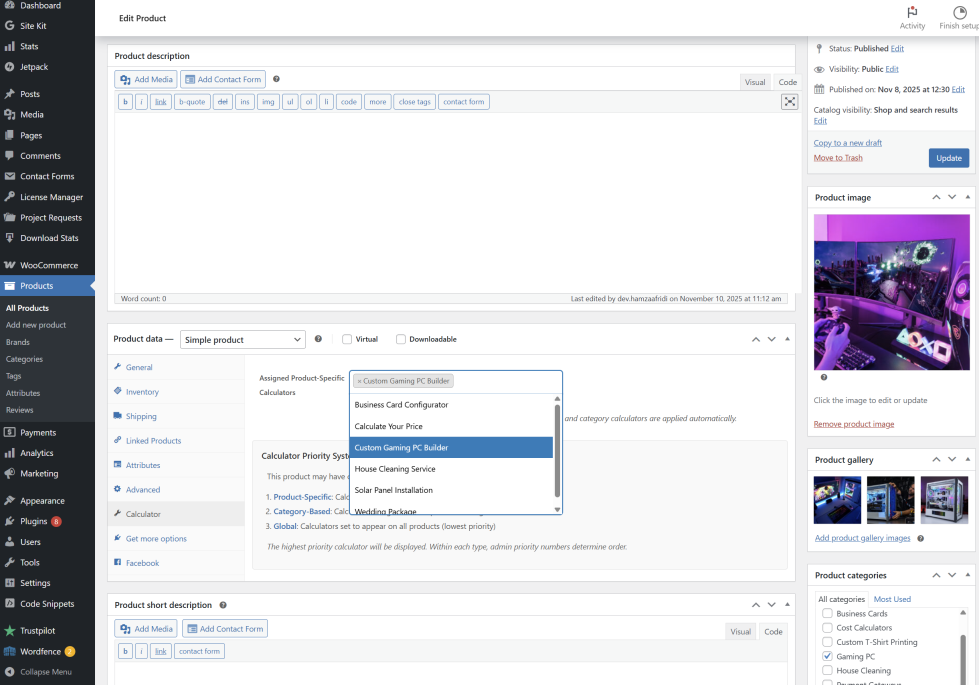 If you chose Product assignment, open the product in WooCommerce > Products, scroll to Product Data, click the Calculator tab, pick your calculator from the dropdown, and save.