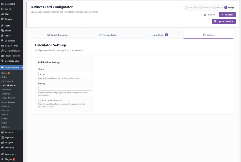 ↑ Back to topSet Status to Active when ready. Use Priority if multiple calculators overlap. Tick Hide Quantity Selector if your calculator already has a quantity field.