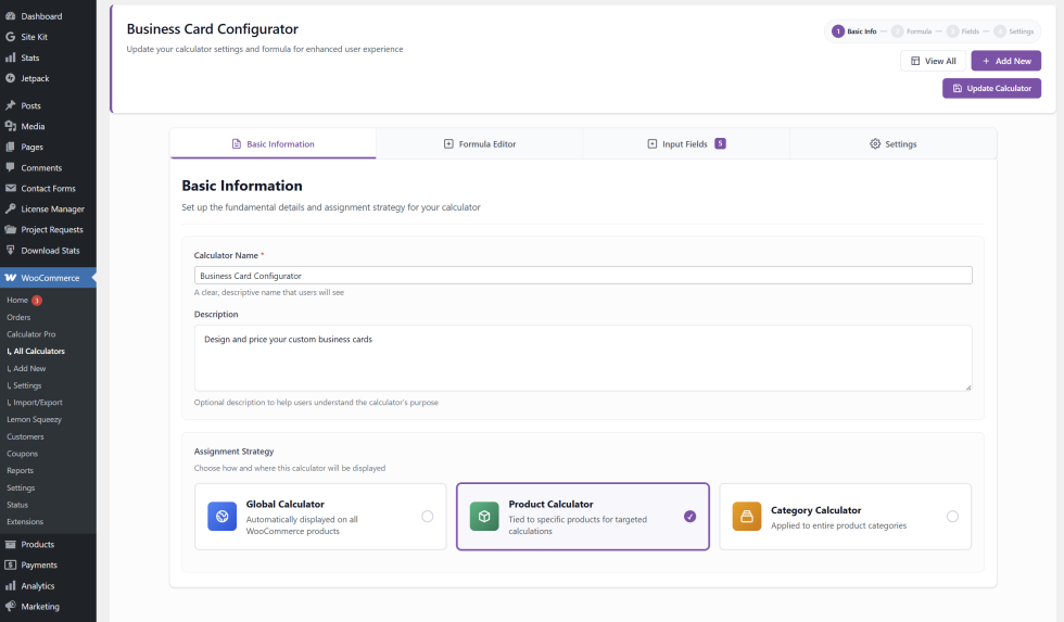 ↑ Back to topGive your calculator a name and choose your Assignment Strategy. Global applies it to all products in your store automatically. Product links it to one specific product. Category automatically applies it to every product in the categories you select โ the most useful option for most stores.