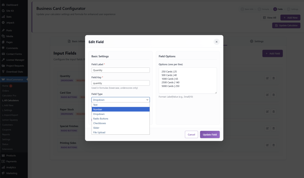 ↑ Back to topClick Add Field to build the inputs customers see. Each field needs a Label and a Field Key. Eight field types are available: Text, Number, Dropdown, Radio, Checkbox, Slider, File Upload, and Textarea.