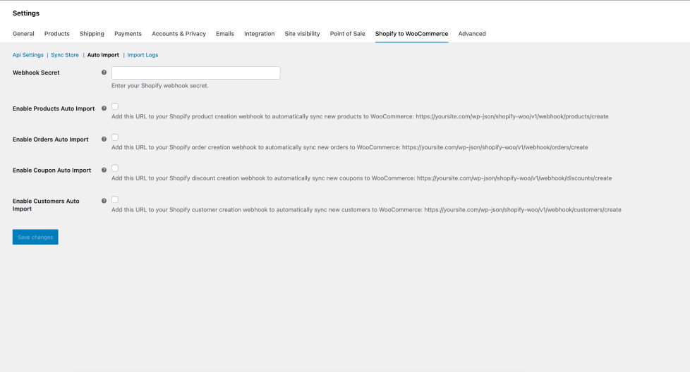 ↑ Back to topThe Auto Import tab is for store owners who want to “set it and forget it.” Using Shopify Webhooks, this feature listens for updates on your Shopify store and automatically mirrors them to your WooCommerce store in real-time.