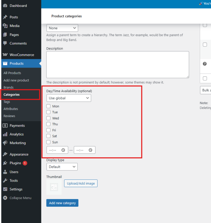 ↑ Back to topInside the Product Categories section in WooCommerce, you’ll notice a new feature called Day/Time Availability (optional).
