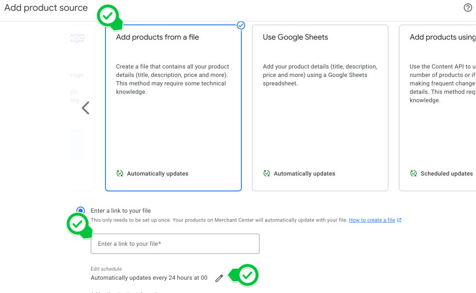 ↑ Back to topTo keep your product information up-to-date, schedule automatic feed fetching within the merchant center of each channel. This ensures that any updates or changes in your WooCommerce store are reflected without manual intervention. Setting up scheduled fetching helps avoid discrepancies between your store and the marketing channel.