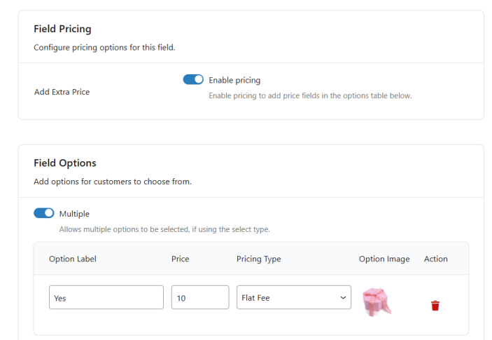 Each field that you add will contain multiple settings such as field type, label, validation rules, pricing options, and more. These settings help you control how the field appears and behaves on the product page.