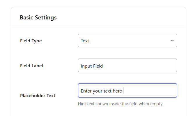 Once you have configured the basic options under General Settings, you can start creating and managing input fields using the Field Builder.