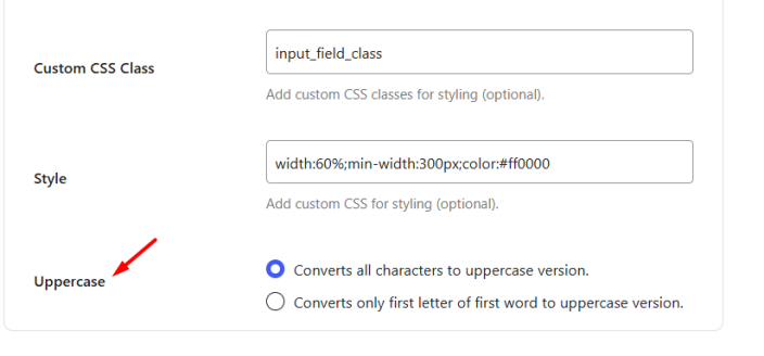 ↑ Back to topBoth these settings are used for appearance of the input fields. You need to add HTML tags for Class and Style settings as shown below: