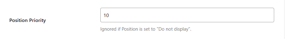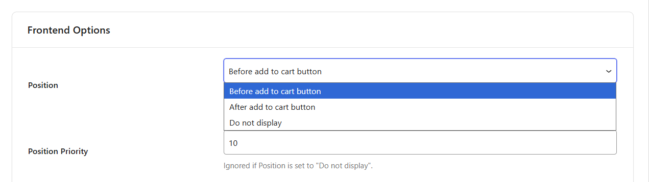 In this setting you can choose the priority for displaying product input field/s on the front end. By default, Position Priority setting is set to 10.