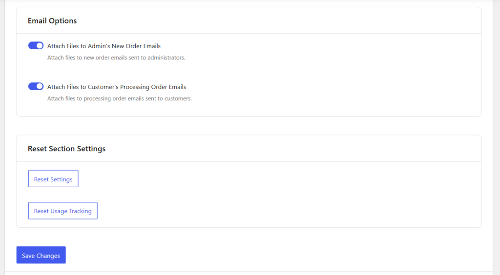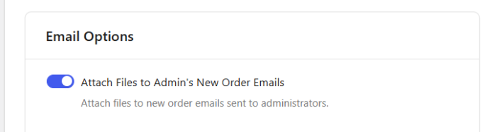When this setting is enabled, the file that the customer uploads on the single product page on the front end will appear in the New Order Email sent to the admin. By default, Attach Files to Admin’s New Order Emails setting is enabled.