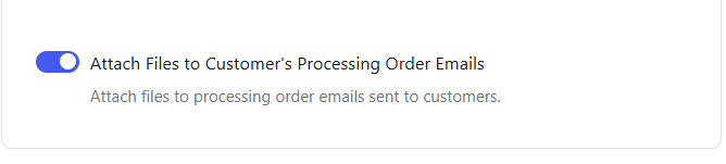 When this setting is enabled, the file that the customer uploads on the single product page on the front end will appear in the Processing Order Email sent to the customer. By default, Attach Files to Customer’s Processing Order Emails setting is enabled.