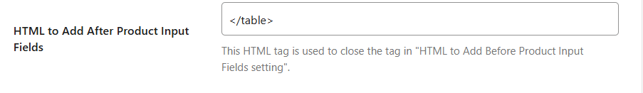 This HTML tag is used to close the tag in HTML to Add Before Product Input Fields setting. By default, it is set to </table>.
