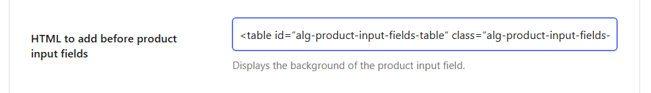 The HTML tag added in HTML to Add Before Product Input Fields setting, will display the background of the product input field. By default, it is set to <table id=”alg-product-input-fields-table” class=”alg-product-input-fields-table”>. This shows that a table format is selected to display the input field/s.