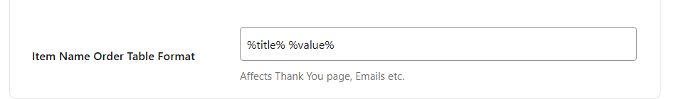 This setting will allow you to set the format for displaying Item name with input field details on Thank you page and Confirmation Email. The default HTML tag for Item Name Order Table Format is | %title% %value%.