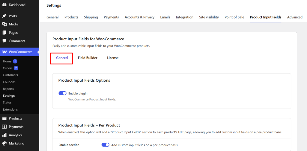↑ Back to topTo go to General Settings page, go to WooCommerce -> Settings -> Product Input Fields -> General link. Default General settings page will appear as shown below: