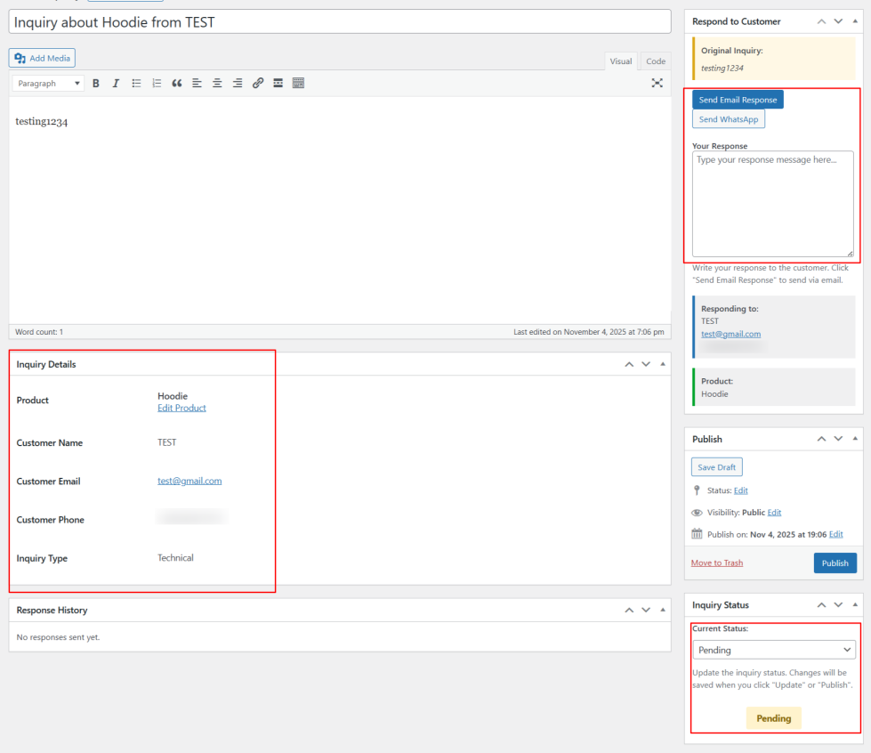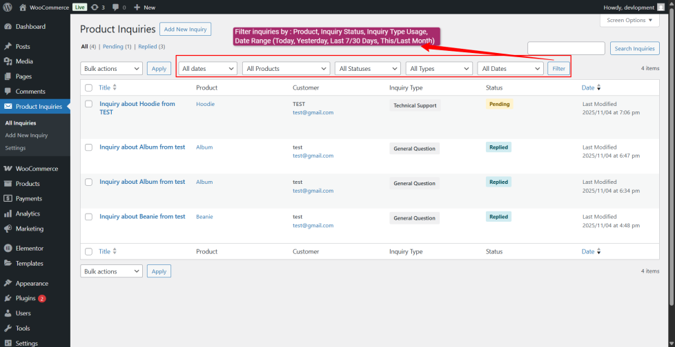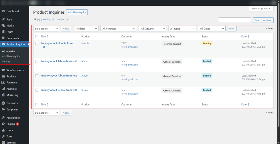 ↑ Back to top- Go to Product Inquiries > All Inquiries in the admin panel.