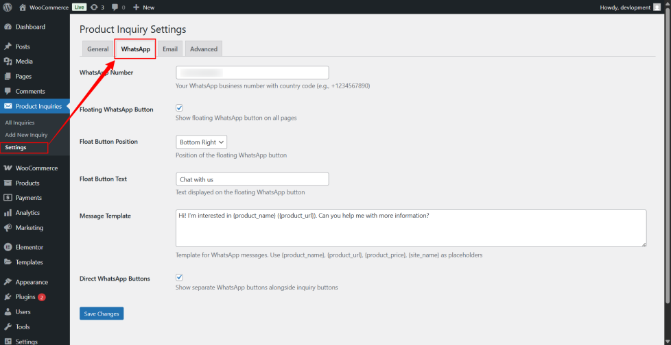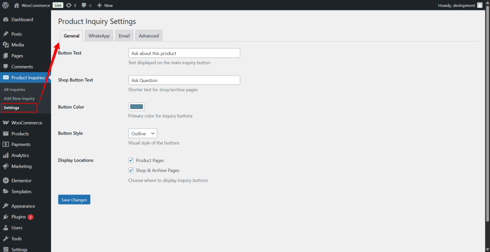 - Enable Display Inquiry Button for single products, shop pages, or both.
