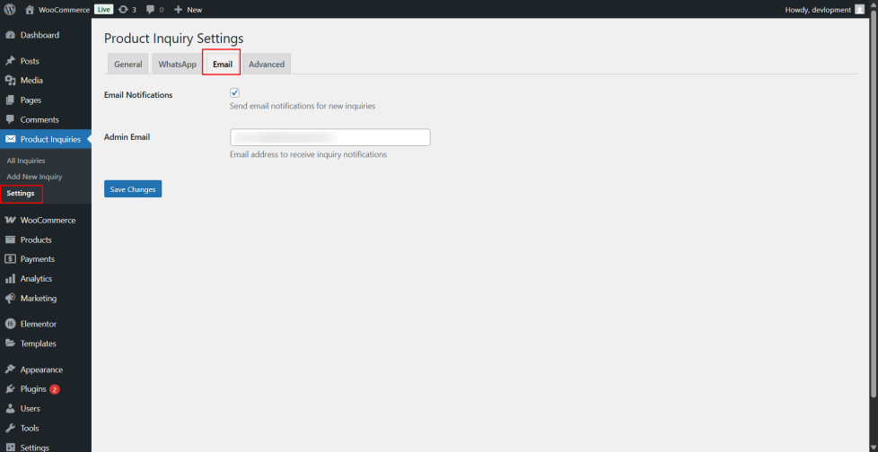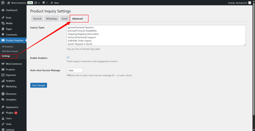 ↑ Back to top- In WordPress admin, navigate to Product Inquiries > Settings.