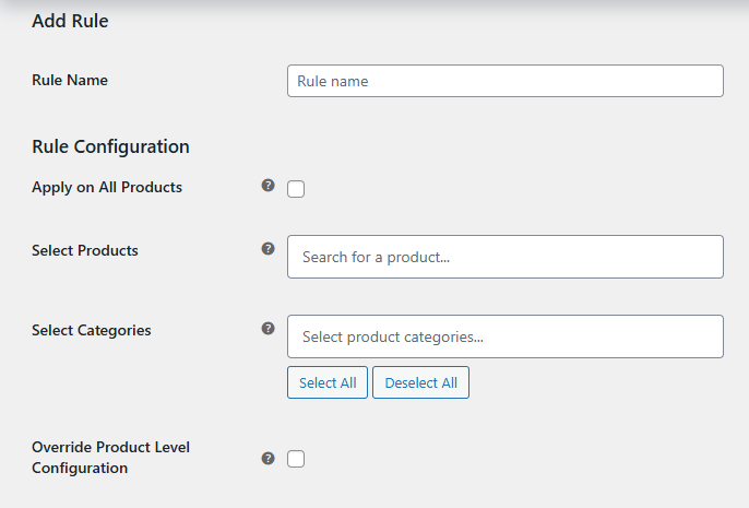 ↑ Back to topThe โRule Configurationโ allows you to specify how the pricing rules are applied to your products. You can choose to apply rules globally or target specific products or categories, with options to override individual product settings if needed.
