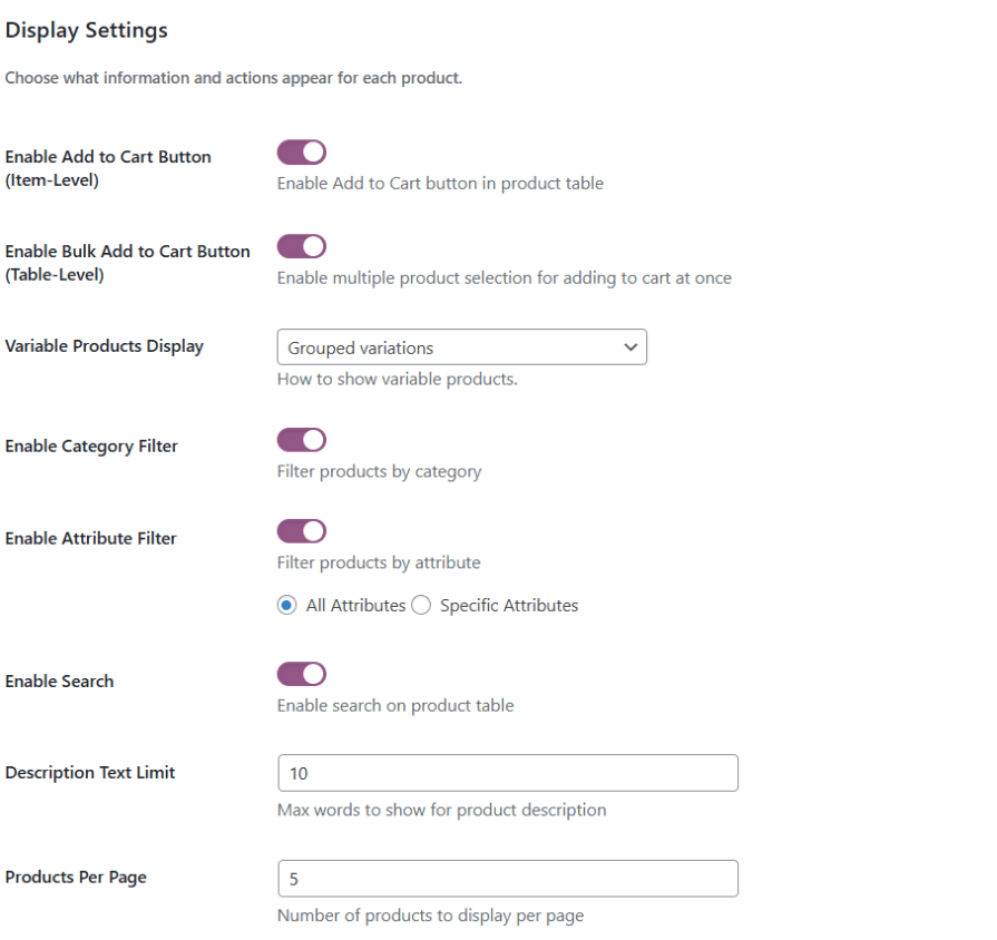 Enable Attribute Filter — Allows filtering by variation attributes (e.g., size, color).