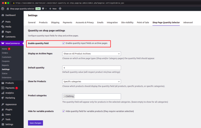 When to use: Choose this if you want the quantity selector to appear globally across your entire WooCommerce store for all customers and all products.