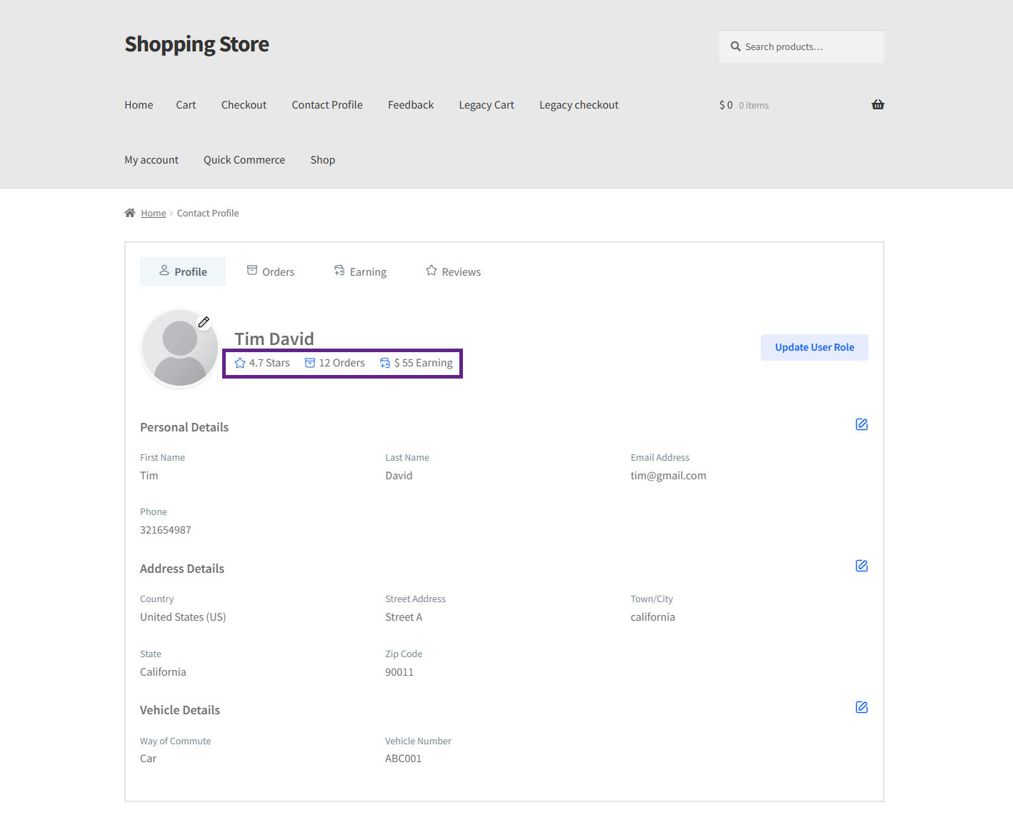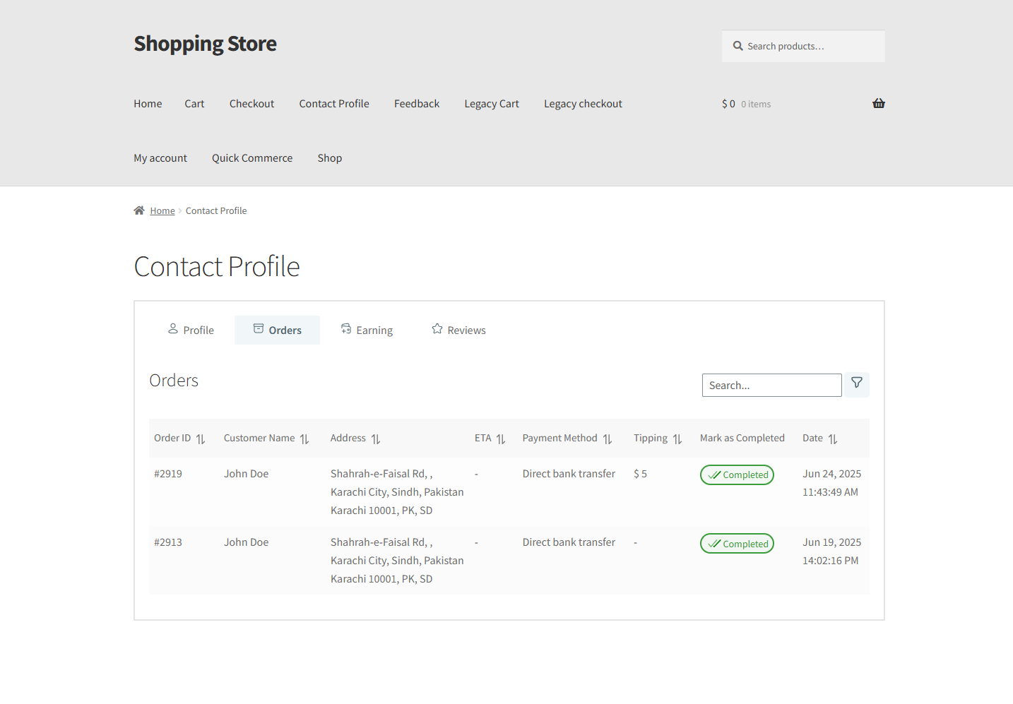 ↑ Back to top- The Contact Profile block allows the contact person to manage their account, including viewing tips earnings, customer reviews, order history, and updating profile details.