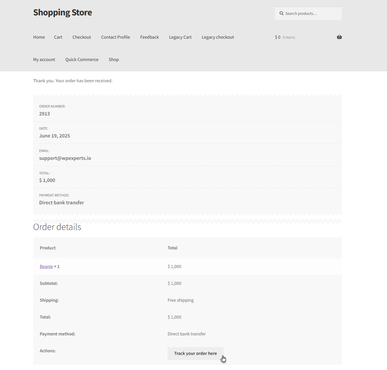 - Place an order. A Track Your Order button will appear on the Thank You page. Click on this button to be redirected to the Order Tracking Page set by the administrator.