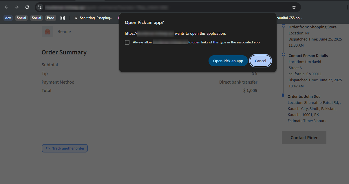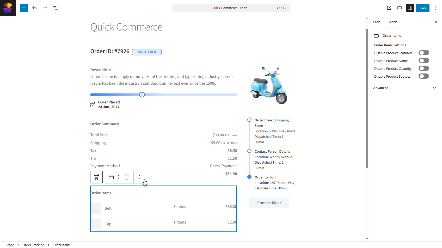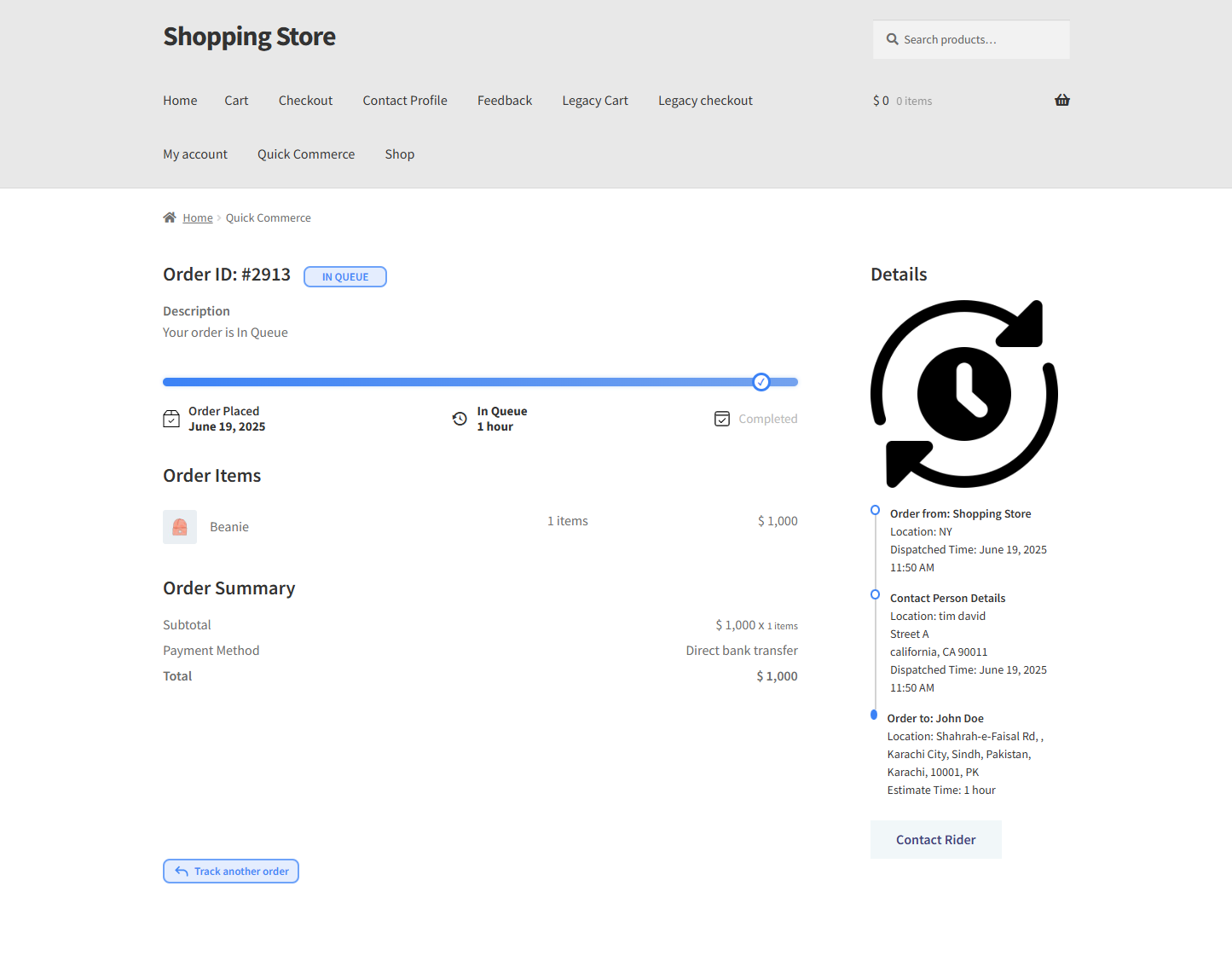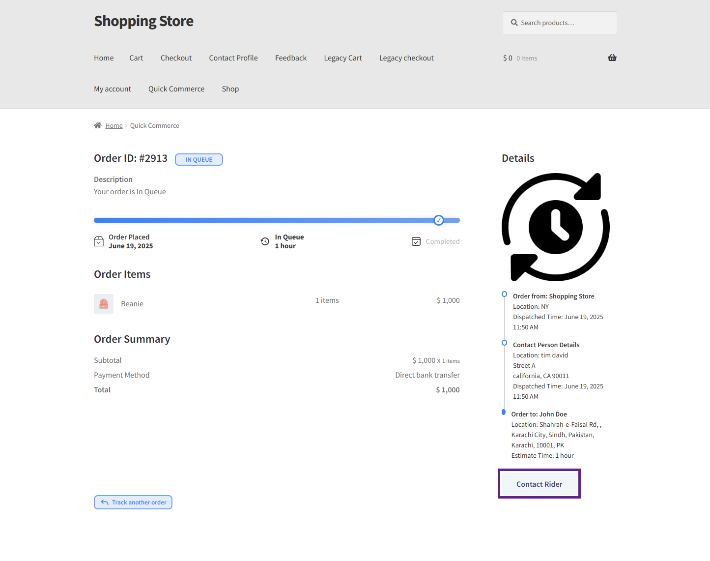 - The Order Tracking Page contains the full order details, including the assigned contact person and rider information.