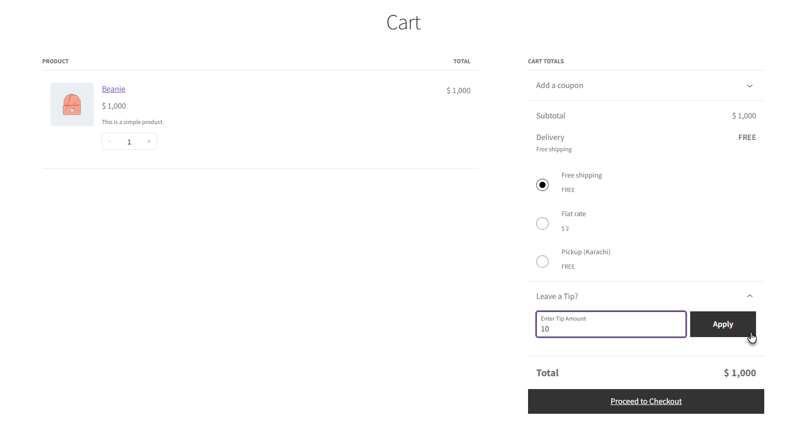 - The tipping option will appear on the Cart and Checkout page. This is forced typing, in which the user has to pay the defined tip.
