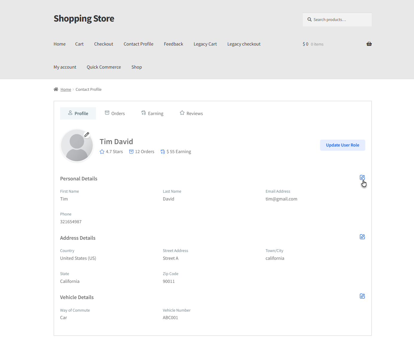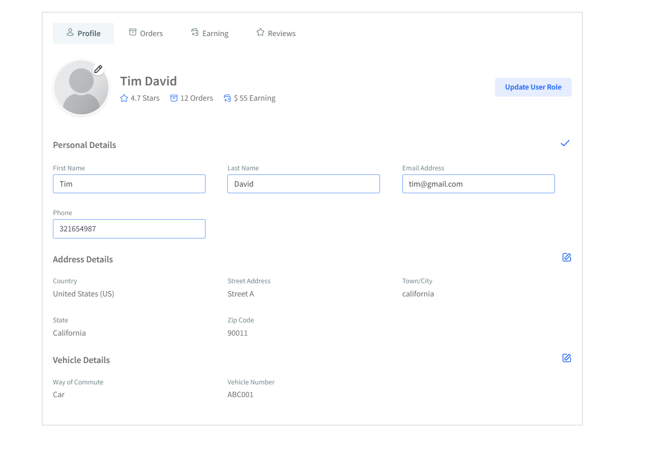 - The fields will become editable, and the contact person can update the information. Similarly, the Contact person can update the address details and Vehicle details.