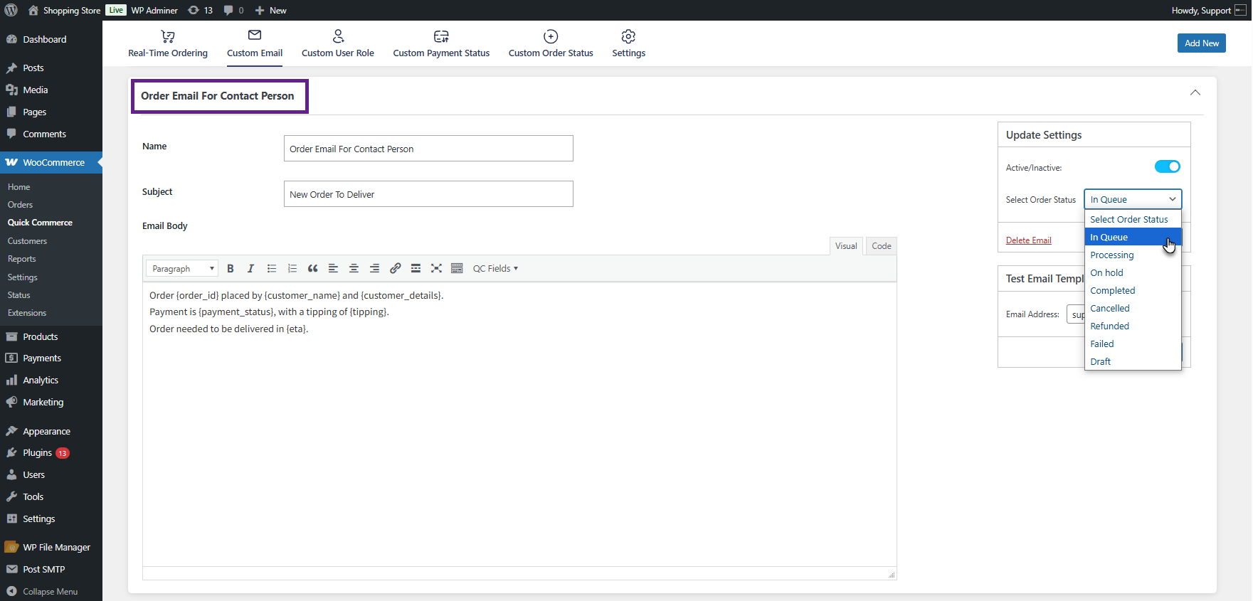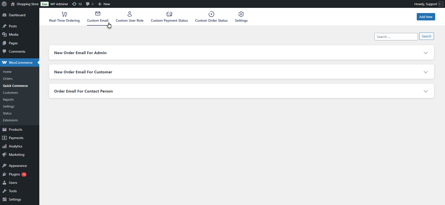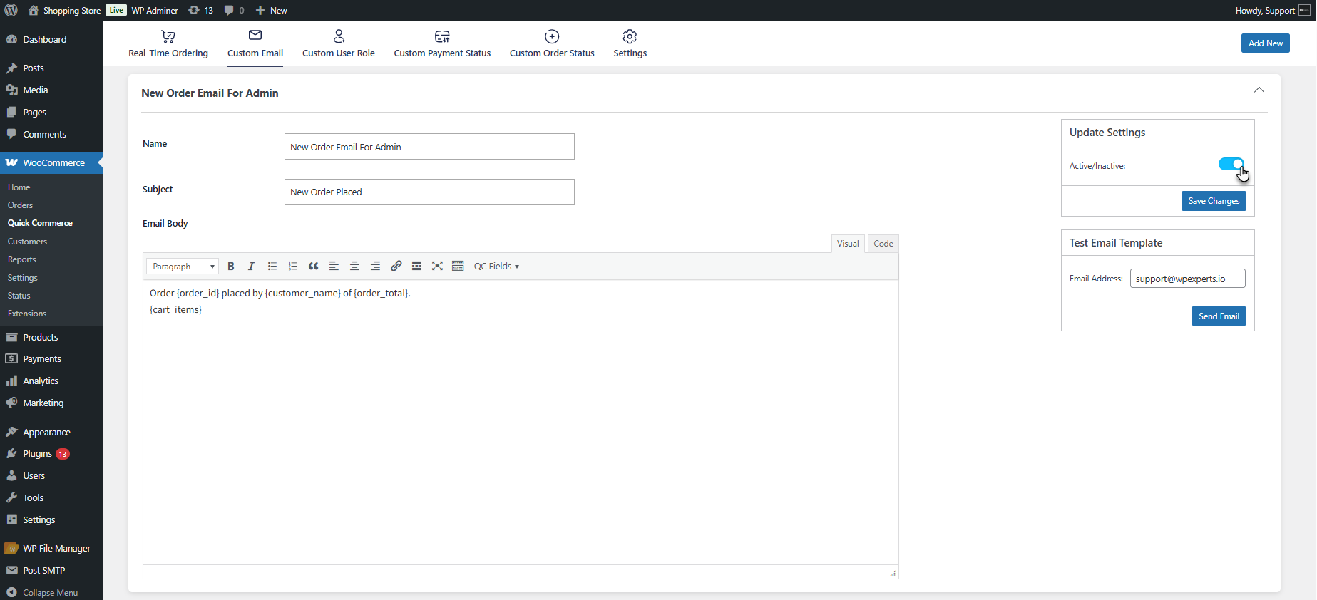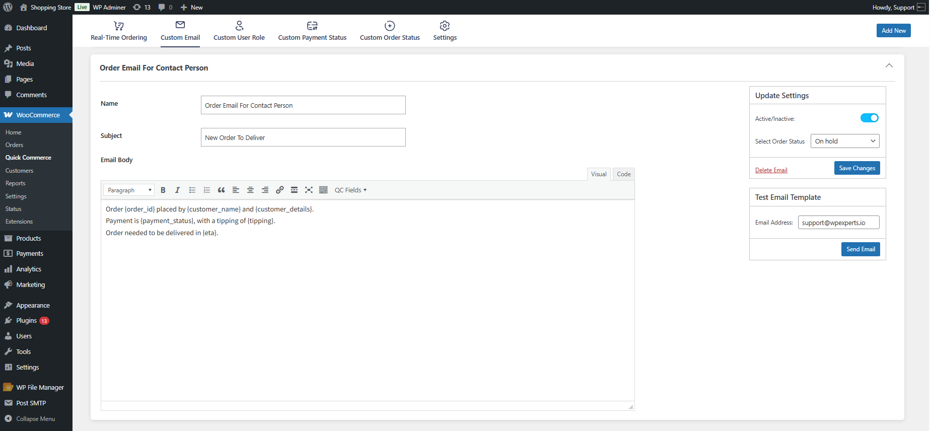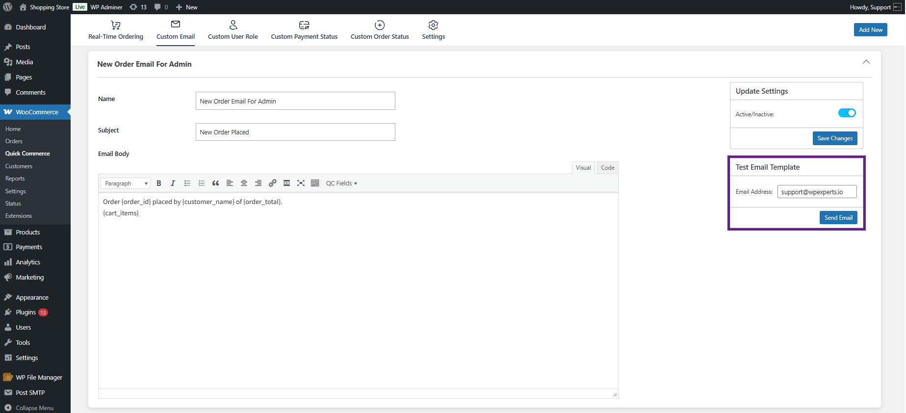 - Go to WordPress Admin Dashboard > WooCommerce > Quick Commerce > Custom Email.