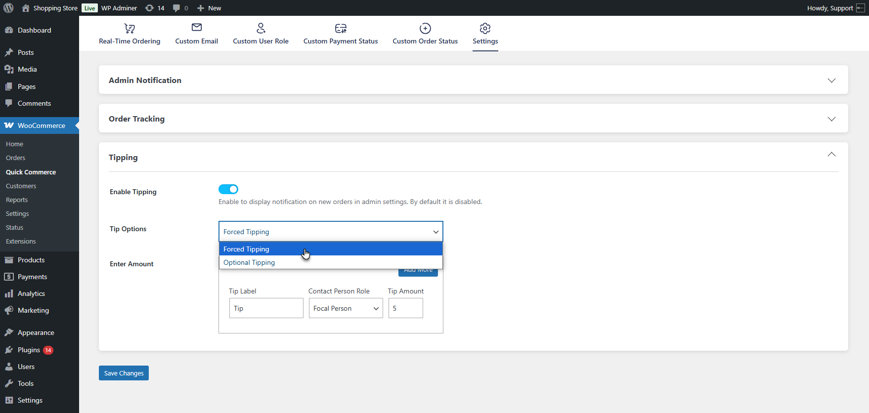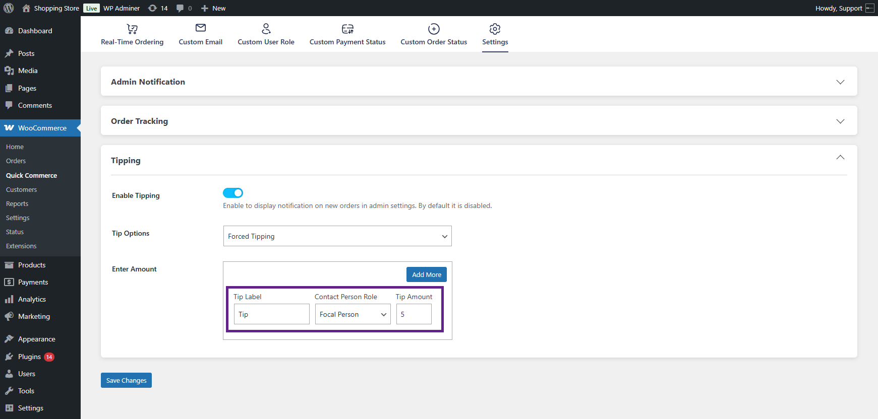 ↑ Back to top- Enable the tipping feature by toggling on the Enable Tipping option. This will add a tipping field on both the Cart and Checkout pages, allowing customers to leave a tip.