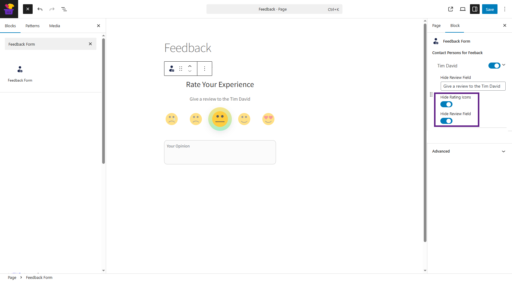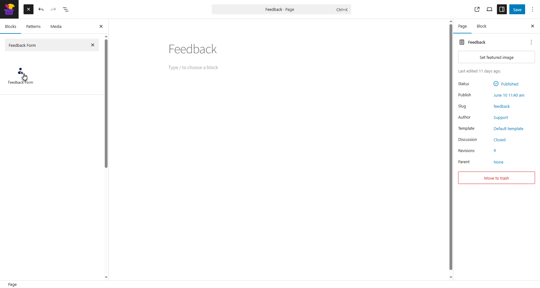 - Click on the “+” block inserter, search for Feedback Form, and click on it to add the block.