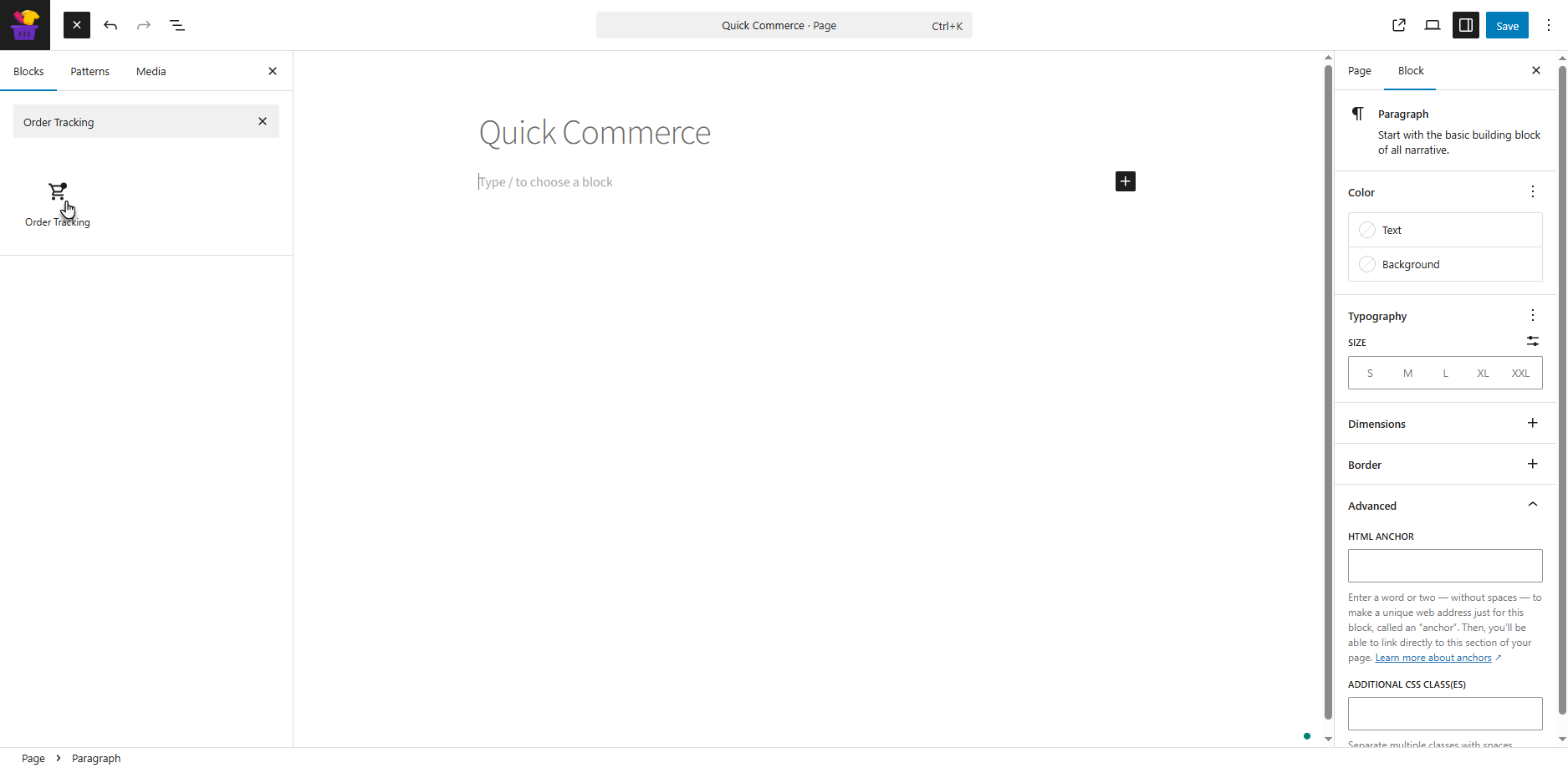 - Click the + button inside the editor, search for Order Tracking, and select the Order Tracking block.