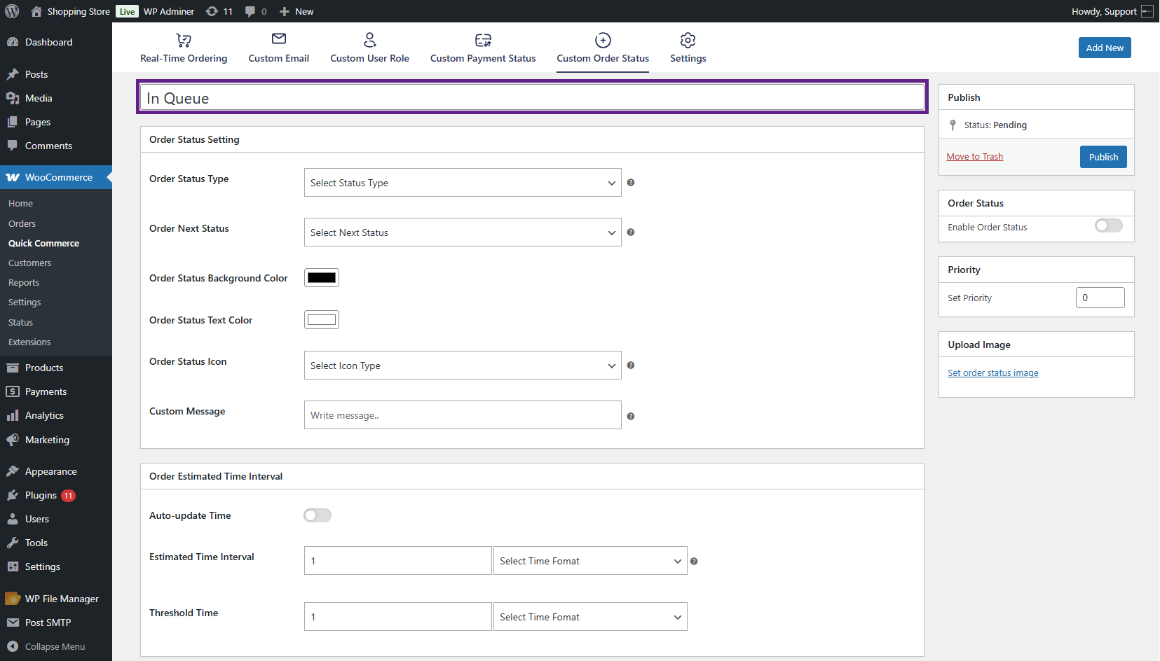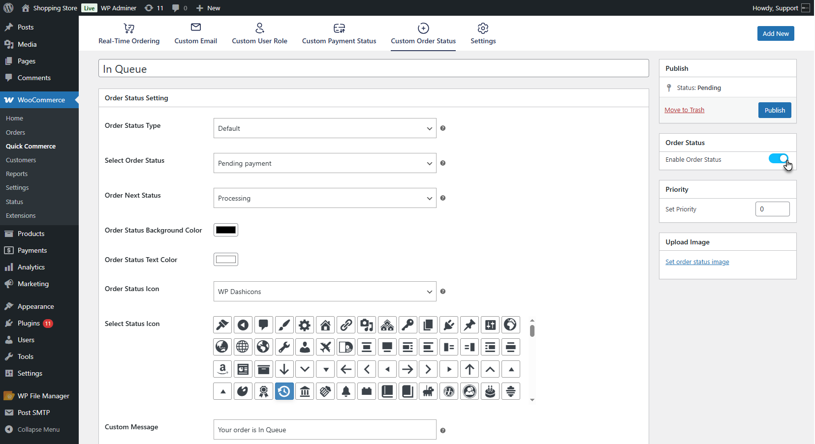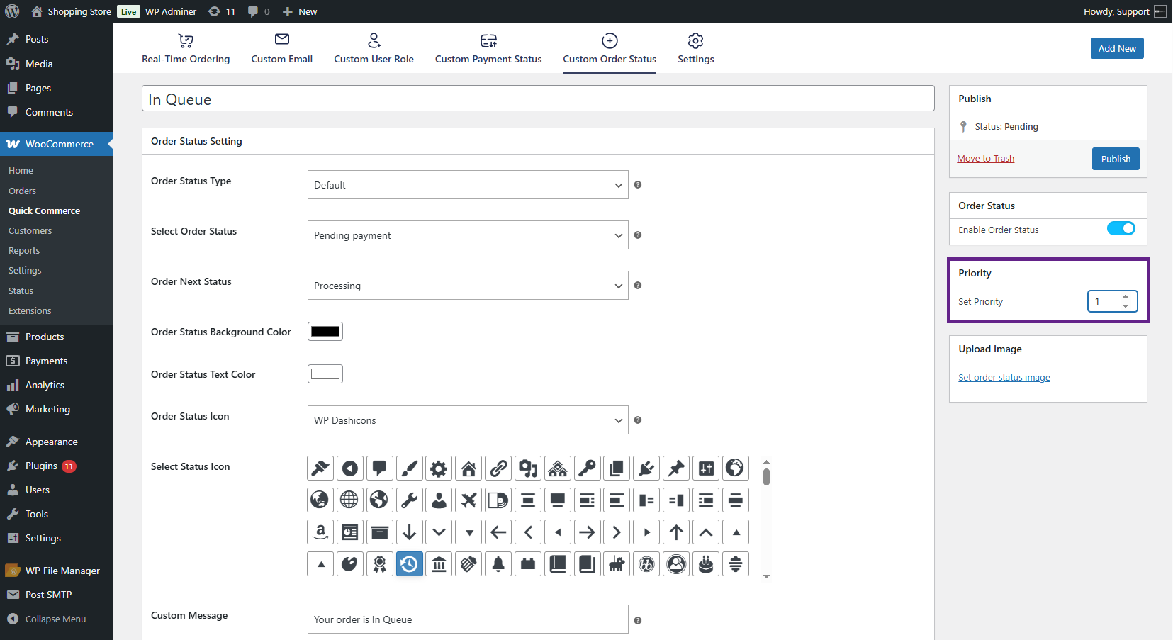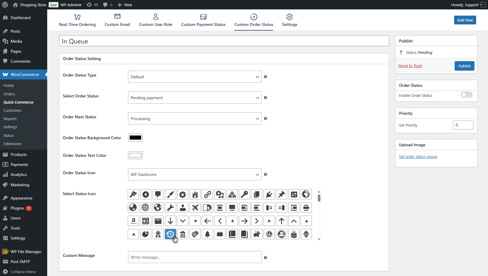 - To add a custom order status, navigate to WordPress Admin Dashboard > WooCommerce > Quick Commerce > Custom Order Status.