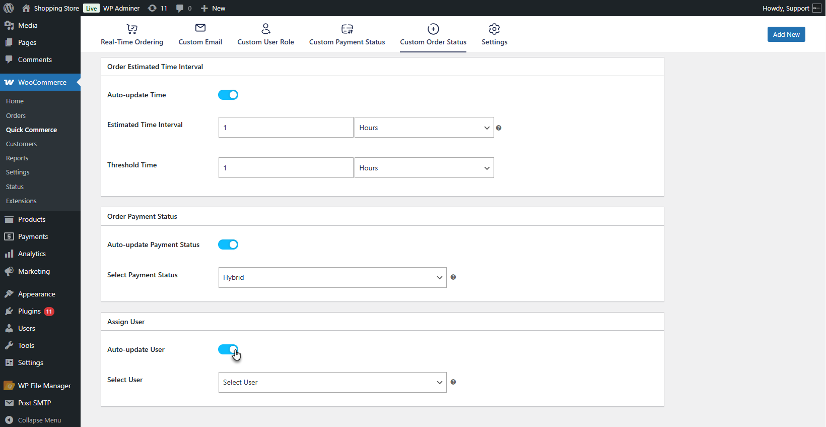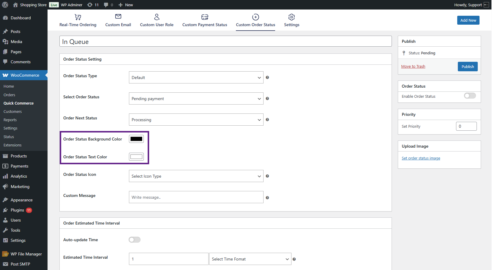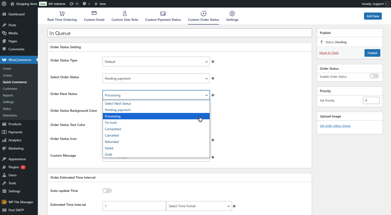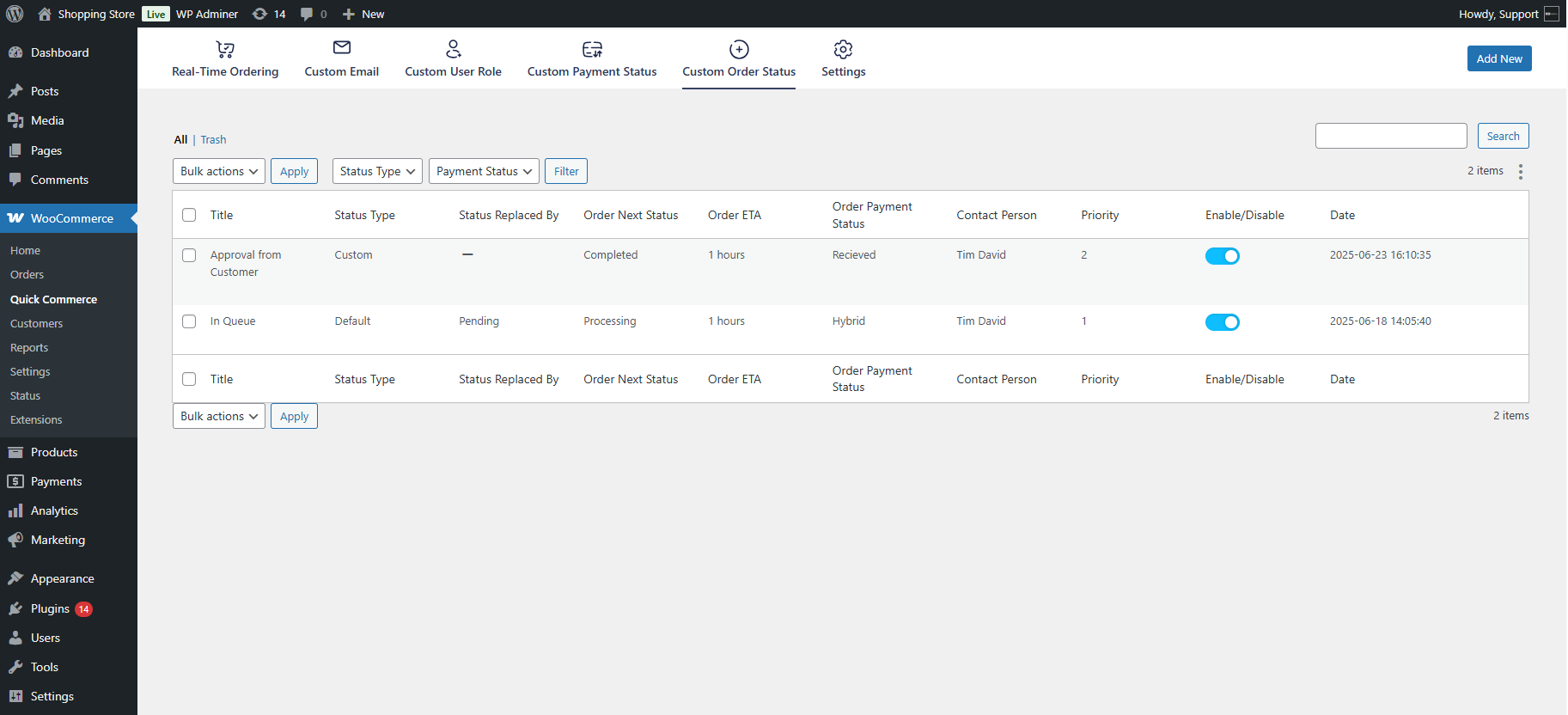 - To add a custom order status, navigate to WordPress Admin Dashboard > WooCommerce > Quick Commerce > Custom Order Status.