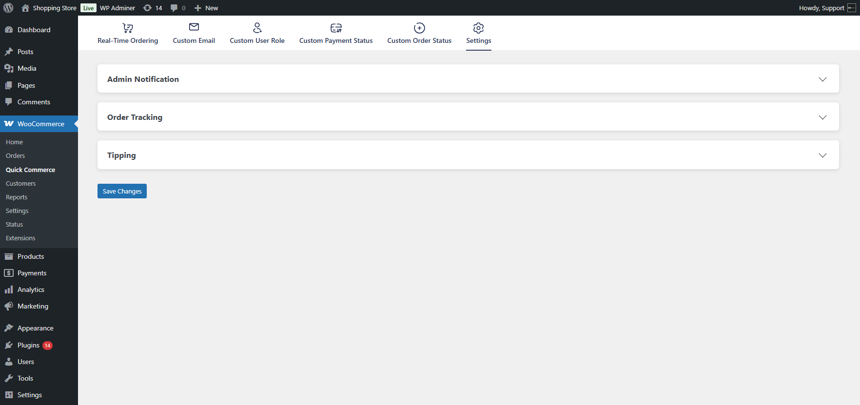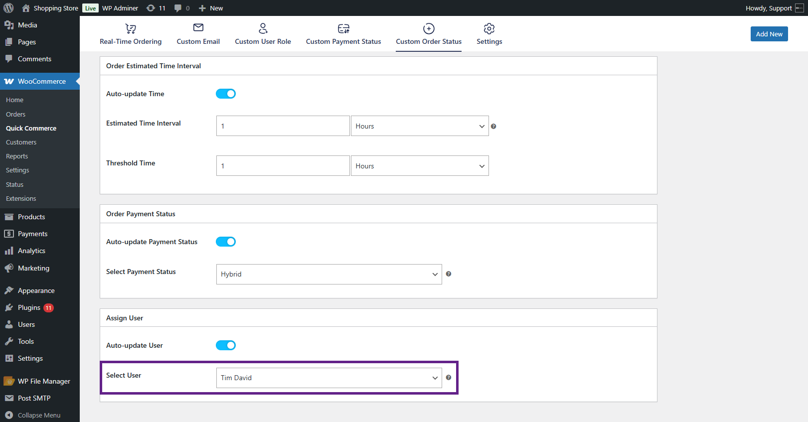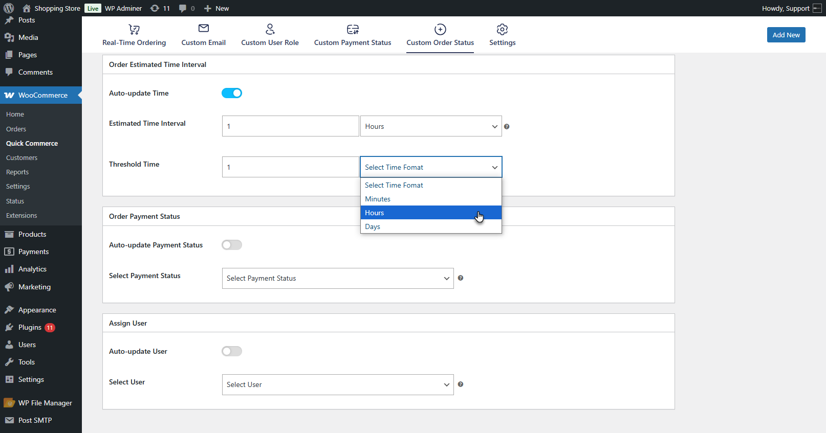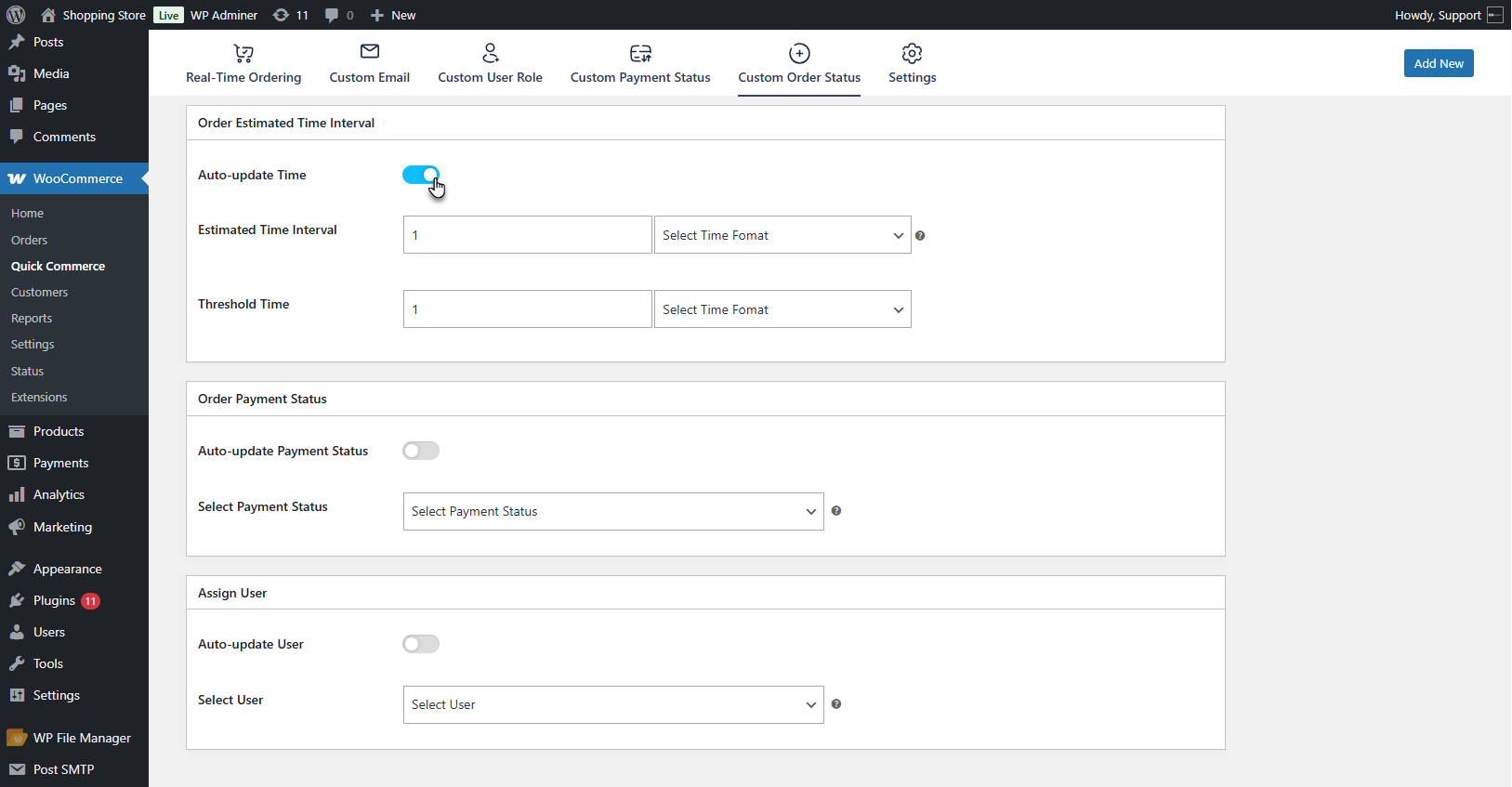- To add a custom order status, navigate to WordPress Admin Dashboard > WooCommerce > Quick Commerce > Custom Order Status.