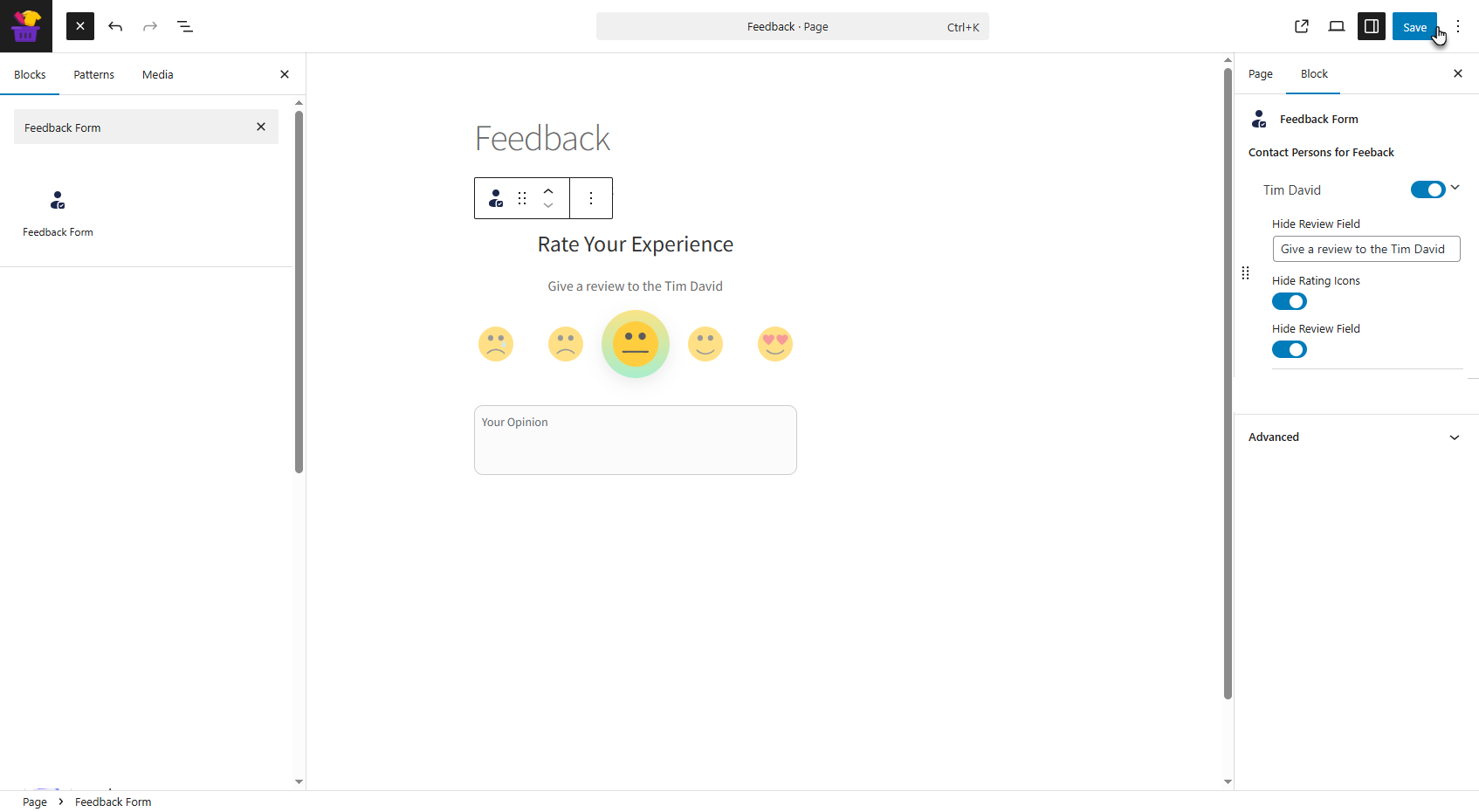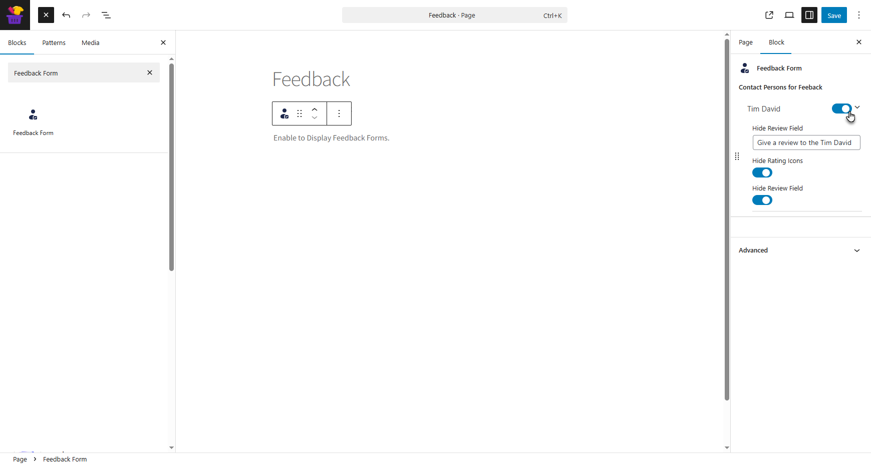 - The Feedback block will be added to the page. The admin can select the contact person for whom the feedback form will be active.